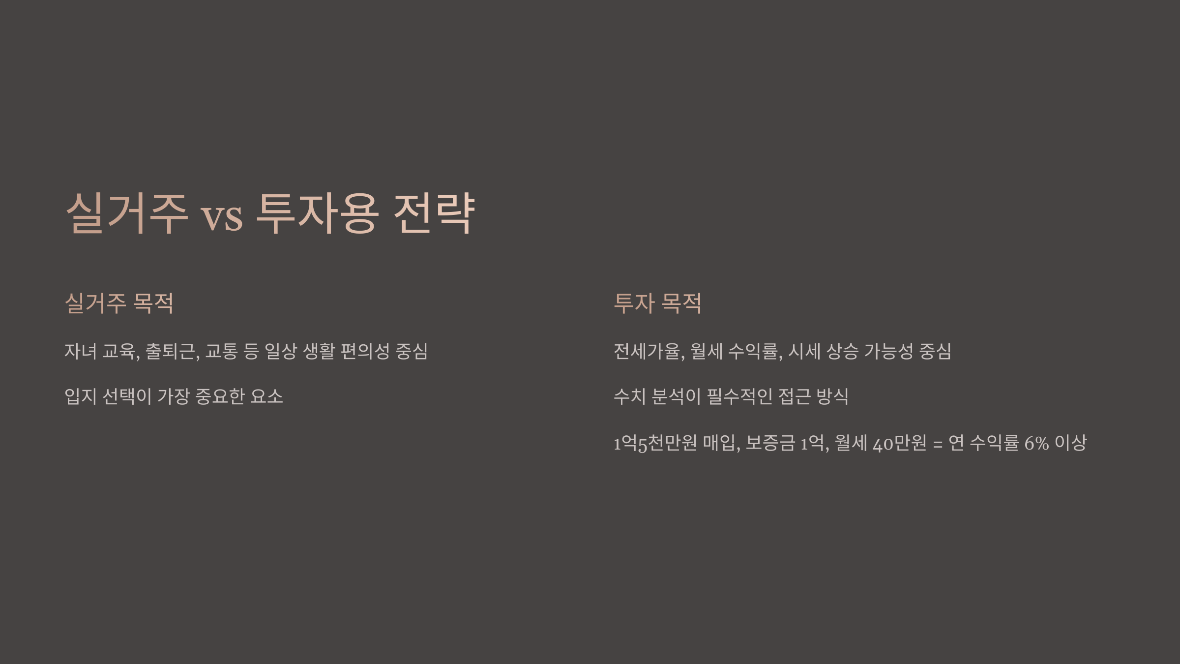 - 투자 목적: 전세가율, 월세 수익률, 시세 상승 가능성 중심으로 수치 분석 필수