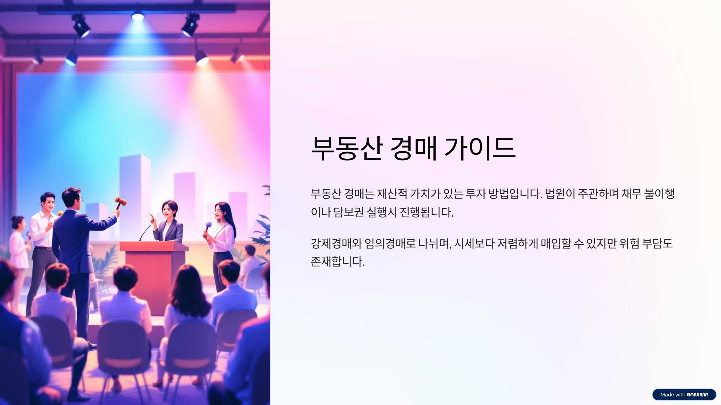 부동산 경매는 말 그대로 법원에서 부동산을 공개 입찰을 통해 판매하는 절차입니다. 일반 매매보다 낮은 가격으로 부동산을 매입할 수 있는 기회이기 때문에, 많은 투자자들이 주목하고 있습니다.
